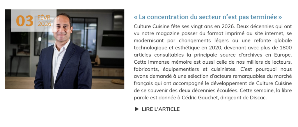 Le magazine Culture Cuisine a donné la parole à Cédric Gauchet, président de DISCAC, pour revenir sur l’évolution de l’entreprise et du marché du meuble de cuisine en France.