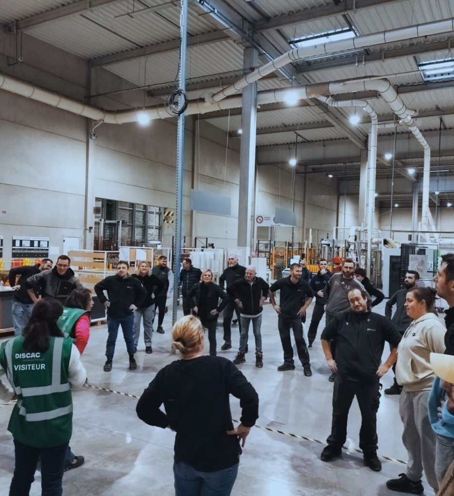 Parce que la santé au travail se joue aussi dans les gestes du quotidien, DISCAC met en place des actions concrètes au plus près du terrain. Chaque jour, en production, dans nos ateliers, des temps d’échauffement sont animés pour préparer le corps, limiter les risques et renforcer l’esprit d’équipe. Une dynamique collective portée par des relais engagés.